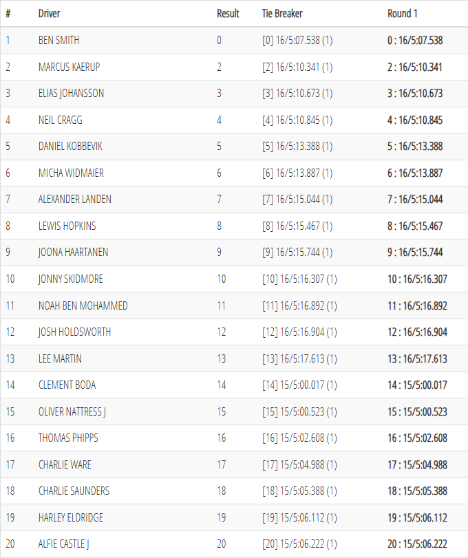 Ben Smith has consolidated on his 2wd practice pace by going fastest in Round 1 of qualifying. Nearly 3 seconds ahead of Marcus Kaerup demonstrated just how consistent and fast he is. Elias Johansson rounded out the top three just behind Kaerup. It feels like a Euros here – lots of top drivers from across Europe. Great to see Lewis Hopkins going 8th….