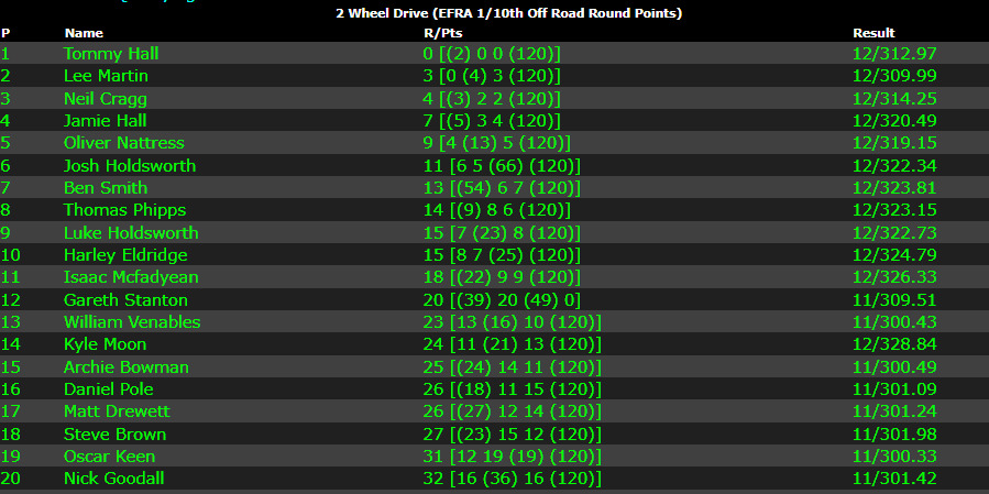 Tommy Hall has taken 2wd qualifying Round 3 which when combined with his Q2 TQ put him at the top of the points table overall. Halls AE 2wd looks absolutely planted and is being driven to the highest standard. Neil Cragg adds another 2nd in round to his tally to sit third overall. And Lee Martin added a 3 to his total.