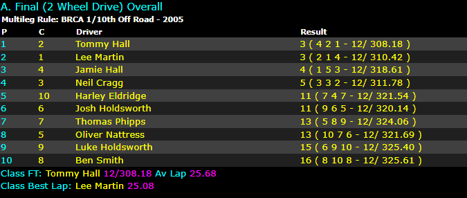 Tommy Hall needed to win Leg 3 of the 2wd A final on a time quicker than 12/310 to displace Lee Martin at the top of the table. He managed to put in a 12/308 and secure the win. This relegated Martin to second with Leg 1 winner Jamie Hall third.