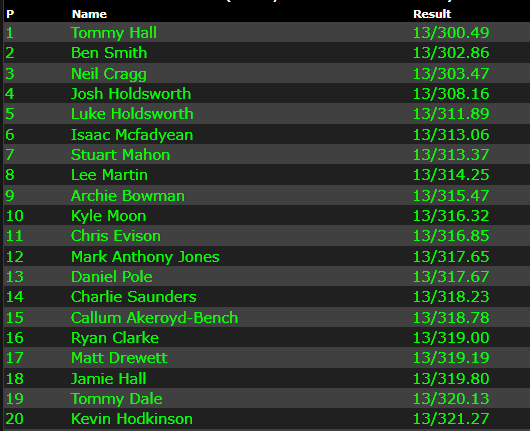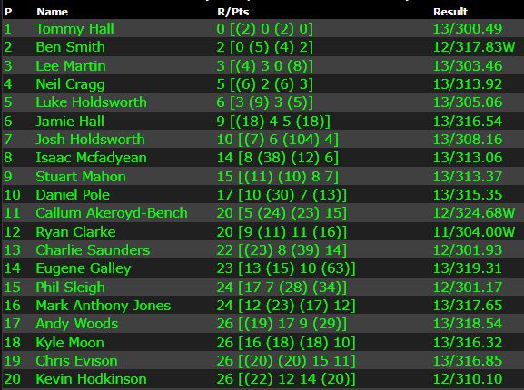 In a hectic last round of qualifying Tommy Hall has come out on top and has secures Pole Position with two ‘0’ scores. Mistakes from Holdsworths, Lee Martin, and Neil Cragg reduced the pressure. However Ben Smith was right there for Hall’s run.