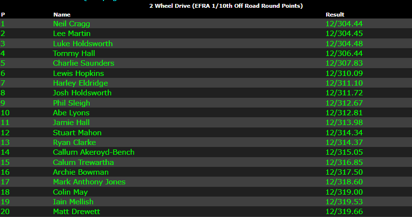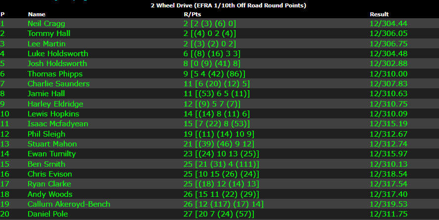 In dramatic style, Neil Cragg has taken 2wd Qualifying Round for by 0.1 seconds from Lee Martin to secure Pole Postion for the 2wd A Finals. This is a good indicator that Neil Cragg may take his 100th National win today – but we will see.