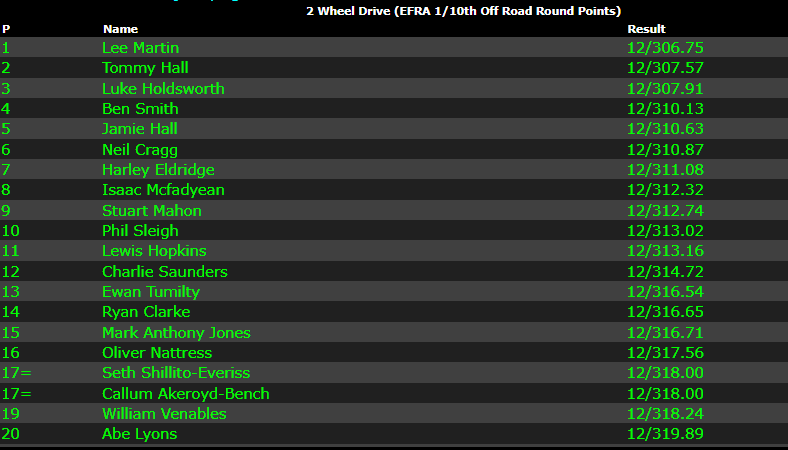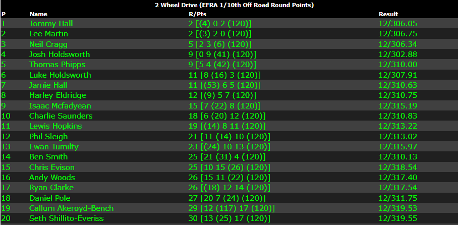 Lee Martin, with a roll on his opening lap, has set the fastest time on 2wd Qualifying Round 3. Multiple mistakes from Josh Holdsworth, Neil Cragg, Thomson Phipps, and Tommy Hall made it a difficult battle. Hall and Martin are now matched on points, but Hall’s time is faster….