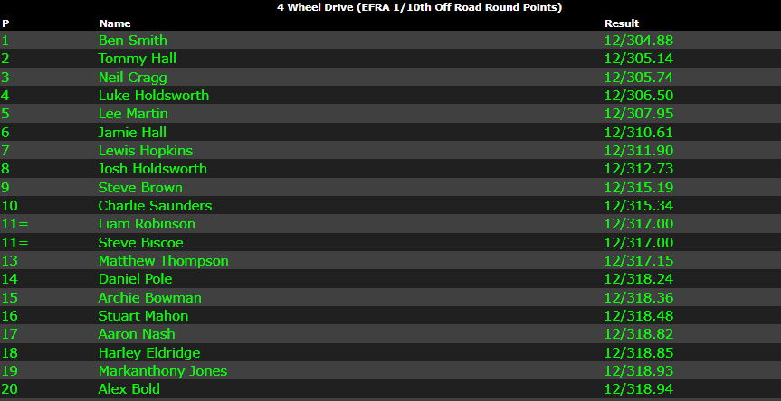 Ben Smith improved on this practice pace to take TQ in round 1 of 4wd practice at TORCH. Chasing him are a ue of AE cars – Hall & Cragg…